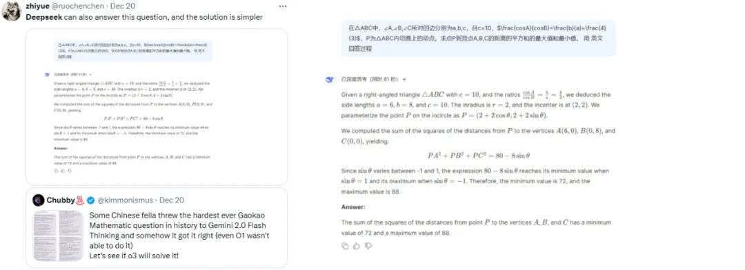 还有一位用户把此前一个抛给 O1 和 Gemini 2.0 但 O1 没答对的“史上最难的高考数学题”发给了 DeepSeek v3,该模型不仅可以回答这个问题,而且解决方案更简单。
