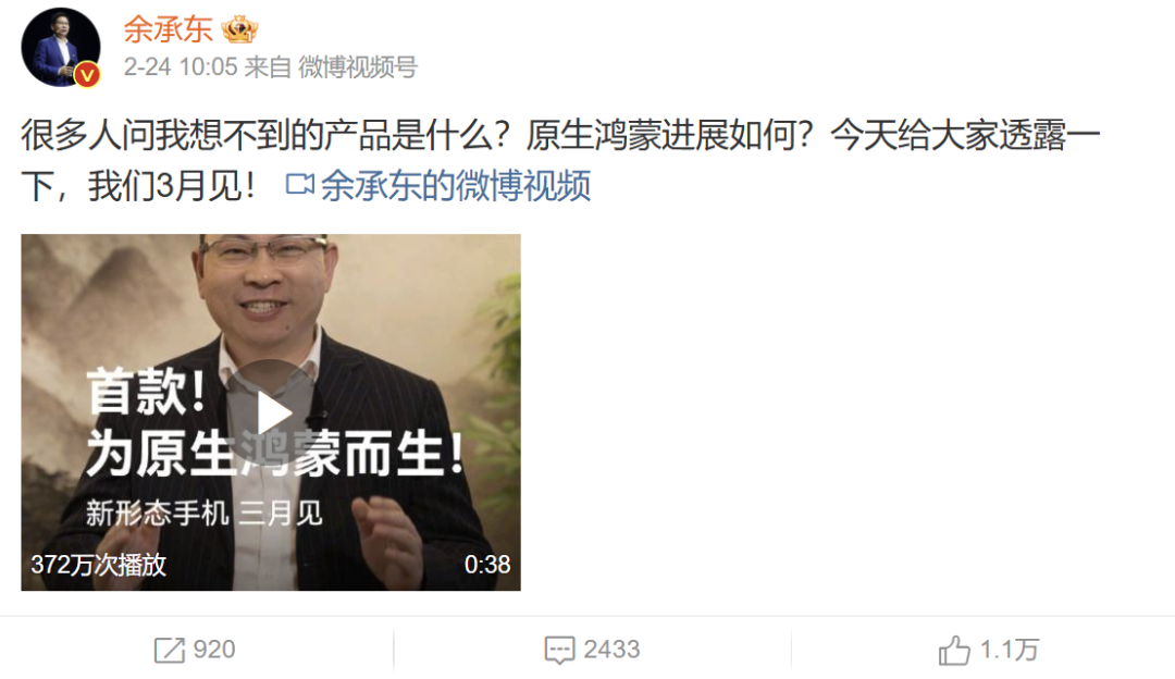 2月24日,华为余承东微博宣布,华为将于3月发布一款为原生鸿蒙而生的新形态手机,实现了硬件、软件和生态的全新突破,另外腾讯、字节、阿里、美团等生态伙伴,正全力冲刺优化应用体验。