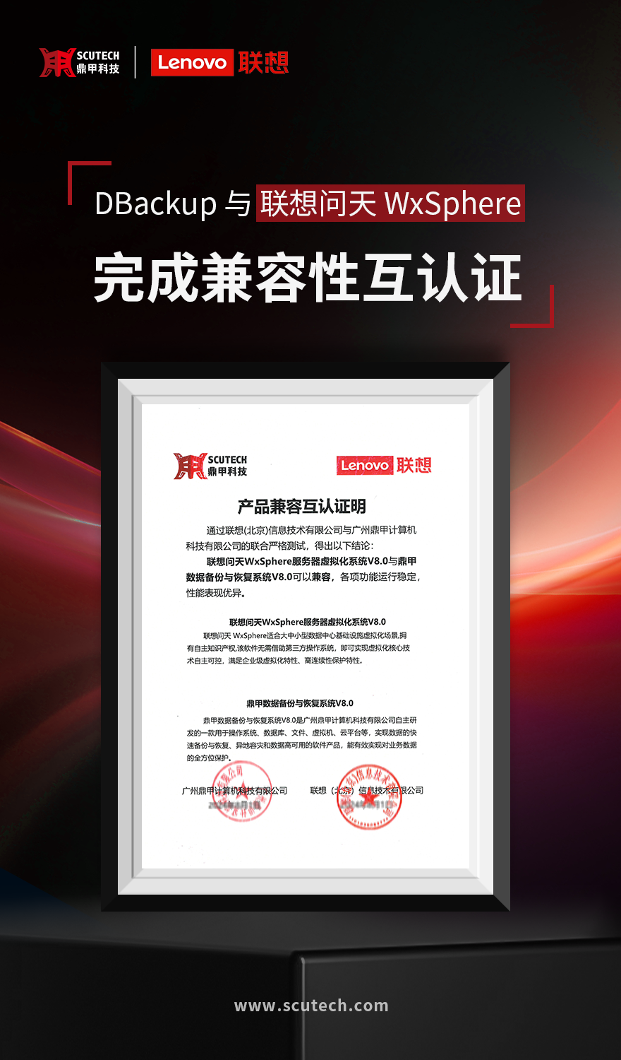 • 联想问天 WxSphere 服务器虚拟化系统 V8.0:拥有自主知识产权,无需依赖第三方操作系统,支持企业级虚拟化和高连续性保护,与鼎甲 DBackup V8.0 兼容后,进一步提升虚拟化场景下的数据安全性。