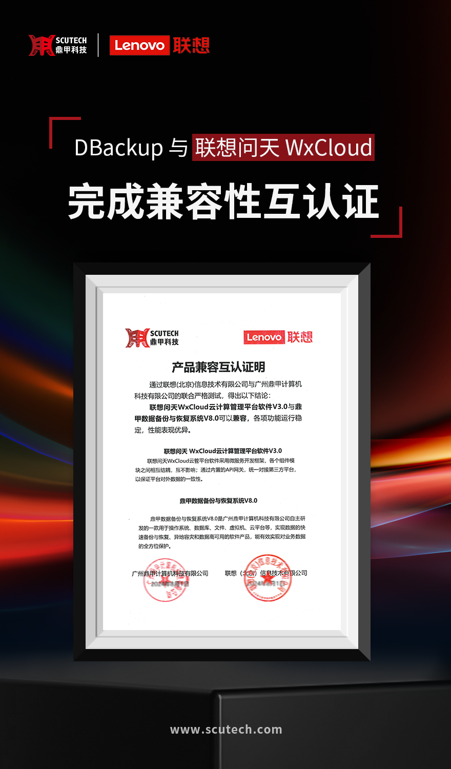 • 联想问天 WxCloud 云计算管理平台软件 V3.0:基于微服务框架设计,组件解耦并通过 API 网关统一对接第三方平台,与鼎甲 DBackup V8.0 结合后,可为云环境提供高效的数据保护。