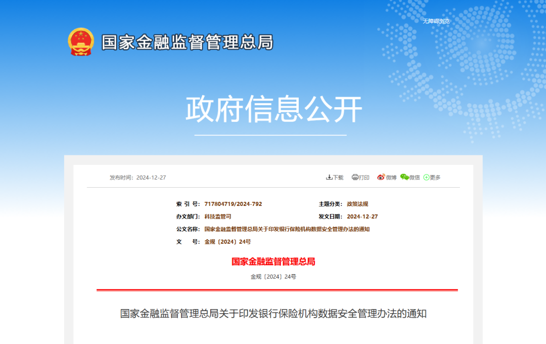 12月27日,金融监管总局发布了《银行保险机构数据安全管理办法》(以下简称《办法》),进一步加强对银行和保险机构数据安全管理的规范。这一新规对于金融行业的数据安全提出了更高的要求,尤其是在灾备、数据存储和敏感数据保护方面,具有重要意义。