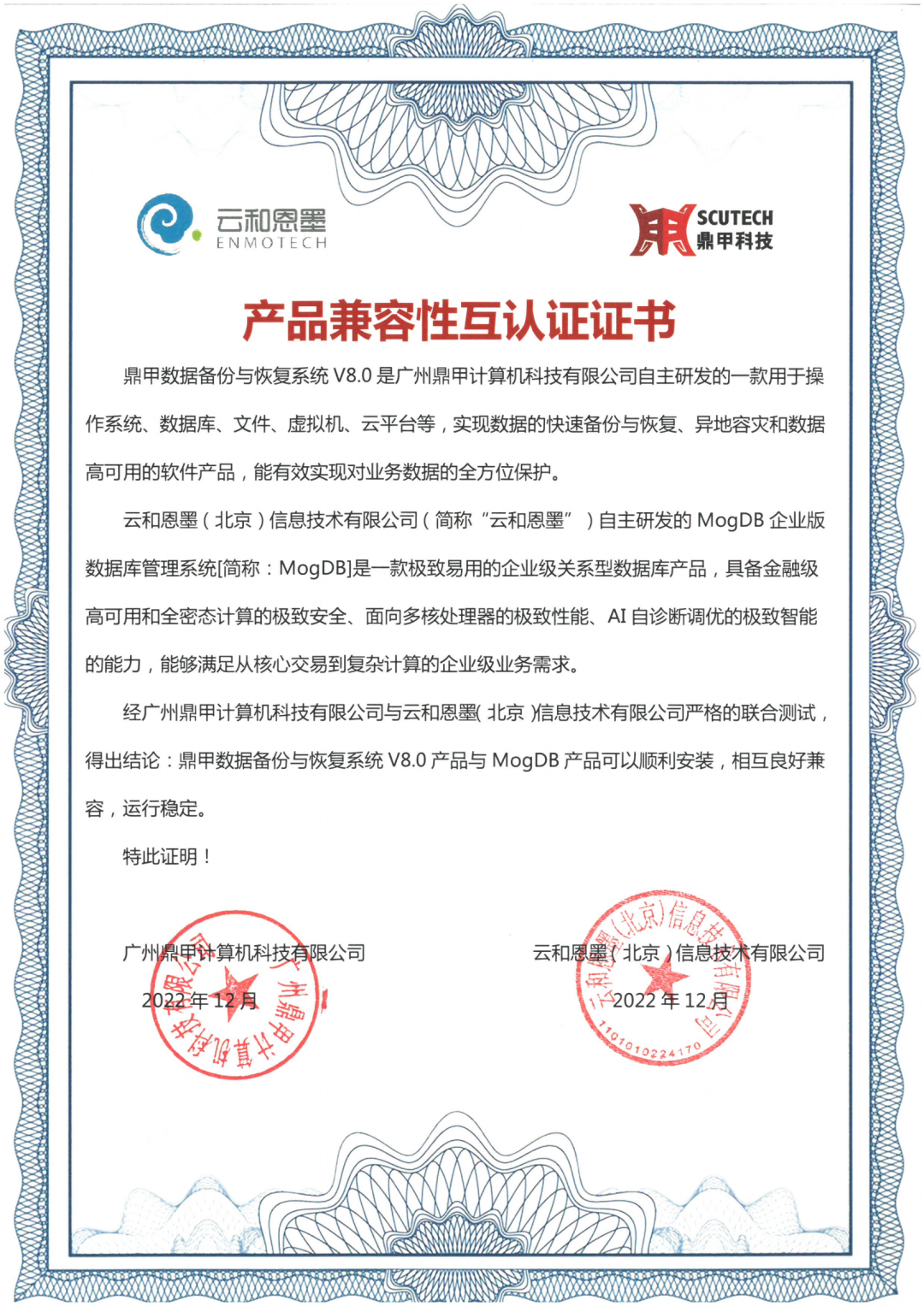 近日,鼎甲的数据备份与恢复系统 V8.0与云和恩墨自主研发的 MogDB 企业版数据库管理系统[简称: MogDB ]完成兼容性测试与联合认证。经严格测试表明,双方产品相互良好兼容,整体运行稳定。