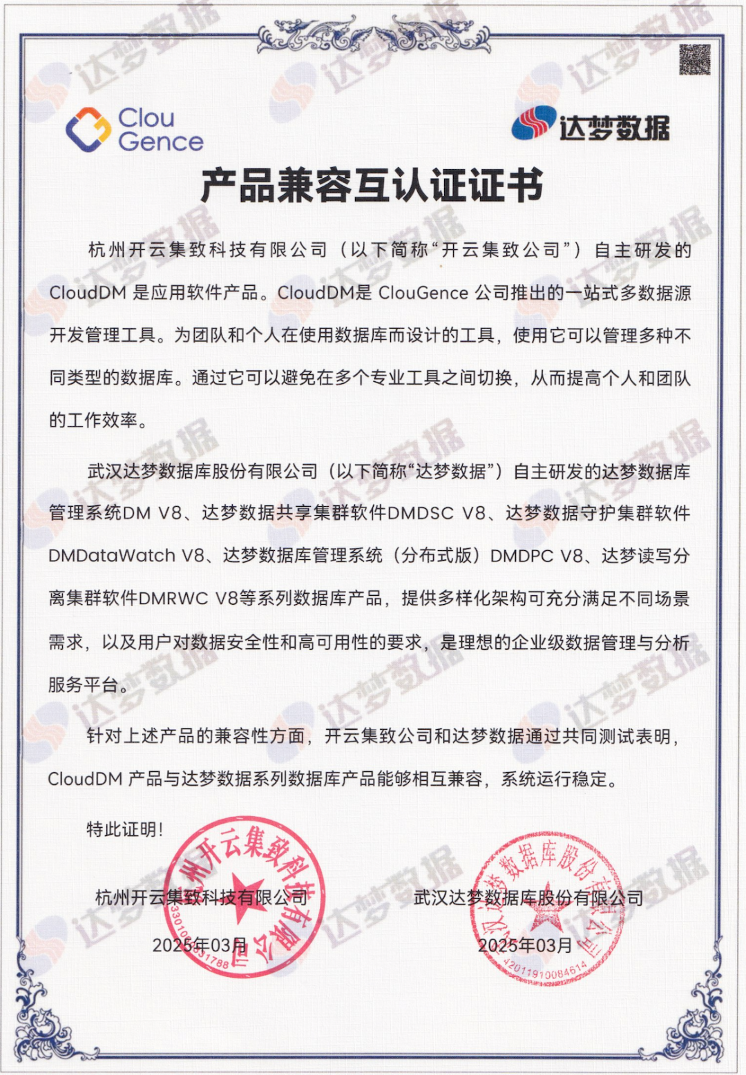 近日,杭州开云集致公司推出的一站式多数据源开发管理工具 CloudDM 与武汉达梦数据库股份有限公司自主研发的 达梦数据系列数据库产品 正式完成 产品兼容性互认证。