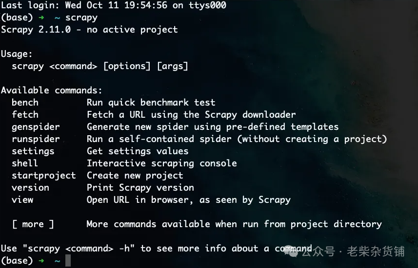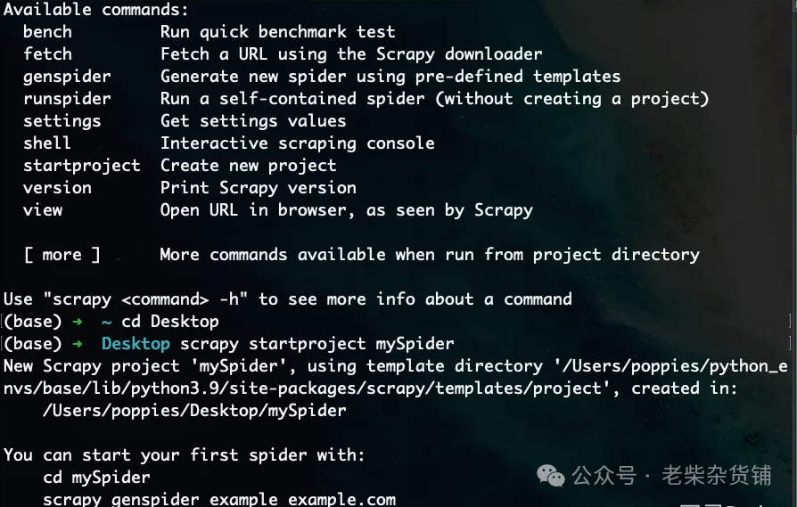 在终端中输入scrapy,如果能看到如下效果,说明安装成功。