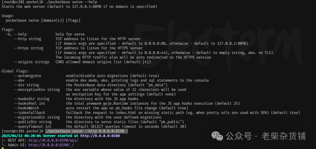 # Linux/macOSwget https://github.com/pocketbase/pocketbase/releases/download/v0.26.6/pocketbase_0.26.6_linux_amd64.zipunzip pocketbase_0.26.6_linux_amd64.zip# Windows可直接下载exeirm https://git.1st.name/https://github.com/pocketbase/pocketbase/releases/download/v0.26.6/pocketbase_0.26.6_windows_amd64.zip -OUtFile pb.zip# 启动服务./pocketbase serve --http 0.0.0.0:8190