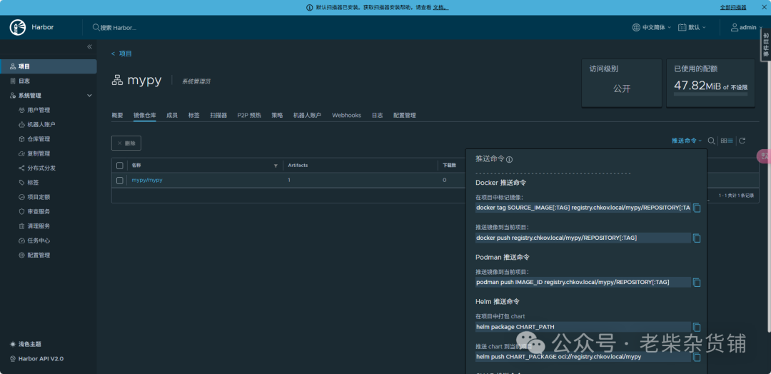 在harbor上新建项目mypy,将新建用户chkov添加为mypy项目管理员,查看推送命令