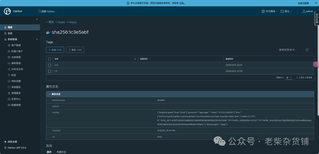 mkdir test&&cd testtee Dockerfile <<EOFFROM python:3.9-slimWORKDIR /appCOPY requirements.txt ./RUN pip install --no-cache-dir -r requirements.txt # 禁用 pip 缓存COPY . .CMD ["gunicorn", "app:app", "--bind", "0.0.0.0:8000"]EOF# 构建镜像docker build -t registry.chkov.local/mypy/mypy:2.0 -f ./Dockerfile .# 登录harbordocker login https://registry.chkov.localdocker push registry.chkov.local/mypy/mypy:2.0