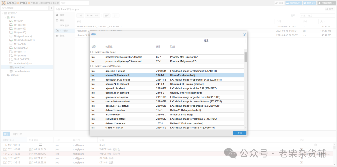 在 Web 界面选择模板(如 Debian、Ubuntu)下载