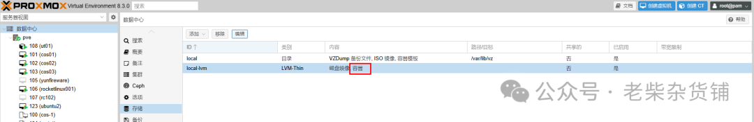 监控资源:通过 PVE 的 Web 界面实时查看容器和虚拟机的 CPU/内存/磁盘使用情况。