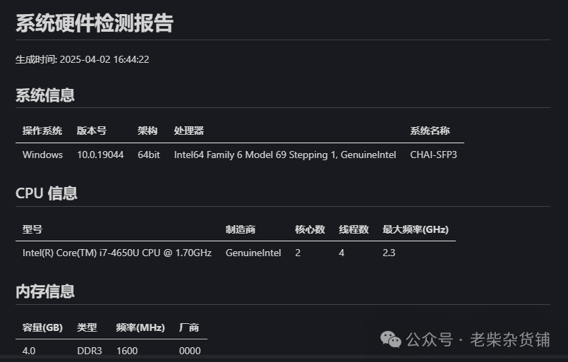 from os import systemimport platformimport subprocessfrom datetime import datetimeimport sysimport psutilimport wmi # 仅限 Windowsdef get_system_info():#获取系统信息system_info = {"操作系统": platform.system(),"版本号": platform.version(),"架构": platform.architecture()[0],"处理器": platform.processor(),"系统名称": platform.node()}return system_infodef get_cpu_info():#获取 CPU 信息cpu_info = []if platform.system() == 'Windows':c = wmi.WMI()for cpu in c.Win32_Processor():cpu_info.append({"型号": cpu.Name.strip(),"制造商": cpu.Manufacturer,"核心数": cpu.NumberOfCores,"线程数": cpu.NumberOfLogicalProcessors,"最大频率(GHz)": round(float(cpu.MaxClockSpeed) / 1000, 2)})else:cmd = "lscpu" if platform.system() == 'Linux' else "sysctl -n machdep.cpu.brand_string"model = subprocess.check_output(cmd, shell=True).decode().strip()cpu_info.append({"型号": model,"制造商": "Unknown","核心数": psutil.cpu_count(logical=False),"线程数": psutil.cpu_count(logical=True),"最大频率(GHz)": round(psutil.cpu_freq().max / 1000, 2) if psutil.cpu_freq() else 'N/A'})return cpu_infodef get_memory_info():#获取内存信息mem_info = []if platform.system() == 'Windows':c = wmi.WMI()for mem in c.Win32_PhysicalMemory():mem_info.append({"容量(GB)": round(int(mem.Capacity) / (1024**3), 2),"类型": _get_mem_type(mem.SMBIOSMemoryType),"频率(MHz)": mem.ConfiguredClockSpeed or 'N/A',"厂商": mem.Manufacturer or 'Unknown'})else:total = psutil.virtual_memory().totalmem_info.append({"容量(GB)": round(total / (1024**3), 2),"类型": "Unknown","频率(MHz)": "N/A","厂商": "Unknown"})return mem_infodef _get_mem_type(mem_type):#转换内存类型代码为文字types = {20: "DDR", 21: "DDR2", 24: "DDR3",26: "DDR4", 30: "DDR5"}return types.get(mem_type, "Unknown")def get_disk_info():#获取磁盘信息disks = []for part in psutil.disk_partitions():if 'cdrom' in part.opts or part.fstype == '':continueusage = psutil.disk_usage(part.mountpoint)disks.append({"设备": part.device,"挂载点": part.mountpoint,"文件系统": part.fstype,"总容量(GB)": round(usage.total / (1024**3), 2)})return disksdef get_gpu_info():"""获取显卡信息(仅限Windows)"""if platform.system() == 'Windows':c = wmi.WMI()return [{"型号": gpu.Name,"显存(GB)": round(int(gpu.AdapterRAM) / (1024**3), 2)} for gpu in c.Win32_VideoController()]return []def get_network_info():"""获取网络适配器信息"""if platform.system() == 'Windows':c = wmi.WMI()return [{"名称": nic.Description,"IP地址": nic.IPAddress[0] if nic.IPAddress else 'N/A',"MAC地址": nic.MACAddress} for nic in c.Win32_NetworkAdapterConfiguration(IPEnabled=True)]# 其他操作系统else:return [{"名称": interface.name,"IP地址": interface.address,"MAC地址": interface.address} for interface in psutil.net_if_addrs().values()]def generate_markdown(data):#生成 Markdown 报告#md = '# 系统硬件检测报告\n'md += '生成时间: '+datetime.now().strftime("%Y-%m-%d %H:%M:%S")+'\n'## 系统信息# 系统信息表md += "\n## 系统信息\n"md += _create_table([data['system']])# CPU 信息表md += "\n## CPU 信息\n"md += _create_table(data['cpu'])# 内存信息表md += "\n## 内存信息\n"md += _create_table(data['memory'])# 磁盘信息表md += "\n## 存储信息\n"md += _create_table(data['disks'])# 显卡信息表md += "\n## 显卡信息\n"md += _create_table(data['gpu'])# 网络适配器信息表md += "\n## 网络适配器信息\n"md += _create_table(data['network'])return mddef _create_table(data):# 生成 Markdown 表格if not data:return "无数据\n"headers = list(data[0].keys())table = "| " + " | ".join(headers) + " |\n"table += "| " + " | ".join(["---"] * len(headers)) + " |\n"for row in data:values = [str(row.get(h, 'N/A')) for h in headers]table += "| " + " | ".join(values) + " |\n"return tableif __name__ == "__main__":hardware_data = {"system": get_system_info(),"cpu": get_cpu_info(),"memory": get_memory_info(),"disks": get_disk_info(),"gpu": get_gpu_info(),"network": get_network_info()}report = generate_markdown(hardware_data)print(hardware_data)with open("HardwareReport.md", "w", encoding="utf-8") as f:f.write(report)print("硬件报告已生成: HardwareReport.md")