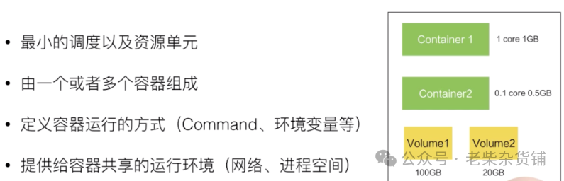 当然在这个 Pod 中也可以包含一些其他所需要的资源:比如说我们所看到的 Volume 卷这个存储资源;比如说我们需要 100 个 GB 的存储或者 20GB 的另外一个存储。