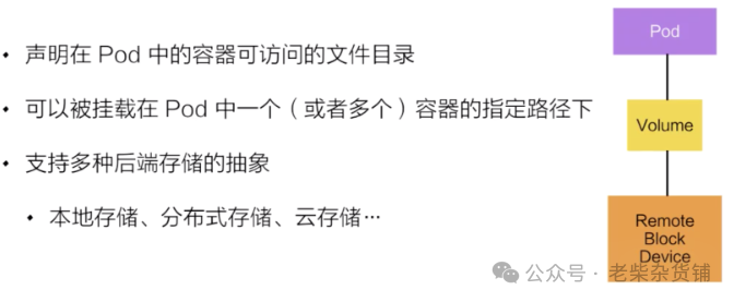 Volume 就是卷的概念,它是用来管理 Kubernetes 存储的,是用来声明在 Pod 中的容器可以访问文件目录的,一个卷可以被挂载在 Pod 中一个或者多个容器的指定路径下面。