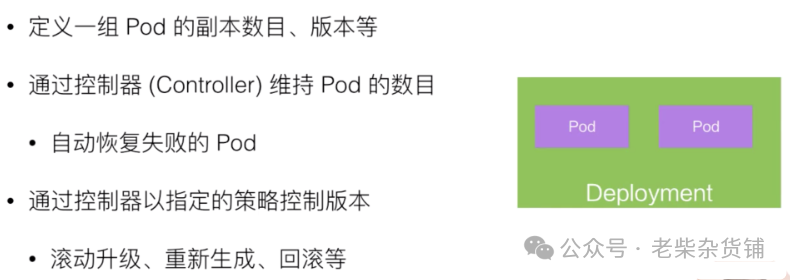 比如说我可以定义一个 Deployment,这个 Deployment 里面需要两个 Pod,当一个 Pod 失败的时候,控制器就会监测到,它重新把 Deployment 中的 Pod 数目从一个恢复到两个,通过再去新生成一个 Pod。通过控制器,我们也会帮助完成发布的策略。比如说进行滚动升级,进行重新生成的升级,或者进行版本的回滚。