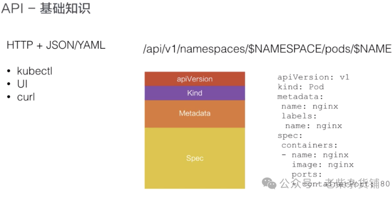 下面有个例子:比如说,对于这个 Pod 类型的资源,它的 HTTP 访问的路径,就是 API,然后是 apiVesion: V1, 之后是相应的 Namespaces,以及 Pods 资源,最终是 Podname,也就是 Pod 的名字。