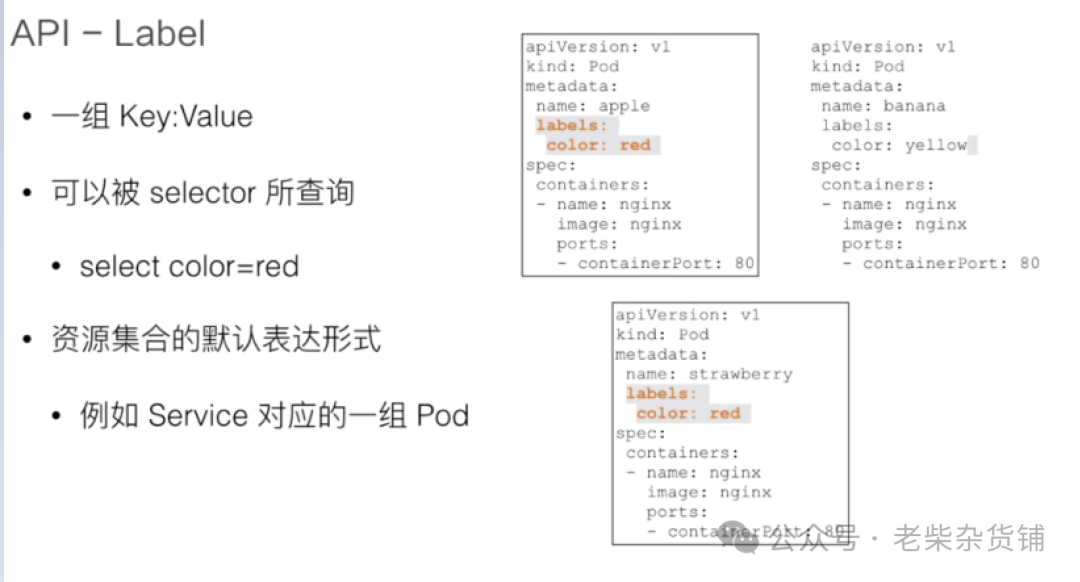 通过 label,kubernetes 的 API 层就可以对这些资源进行一个筛选,那这些筛选也是 kubernetes 对资源的集合所表达默认的一种方式。