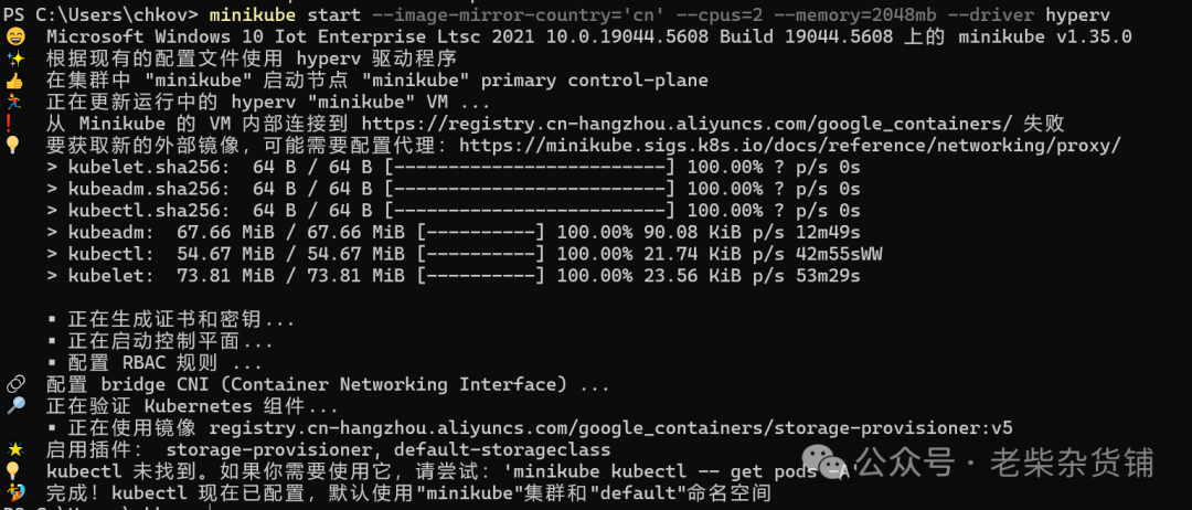 .\minikube.exe start --image-mirror-country cn \--registry-mirror=https://xxxxxx.mirror.aliyuncs.com \--vm-driver="hyperv" \--hyperv-virtual-switch="MinikubeSwitch" \--memory=4096