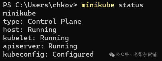 首先,我们先看一下 minikube 的 status,可以看到 kubelet master 和 kubectl 都是配置好的。