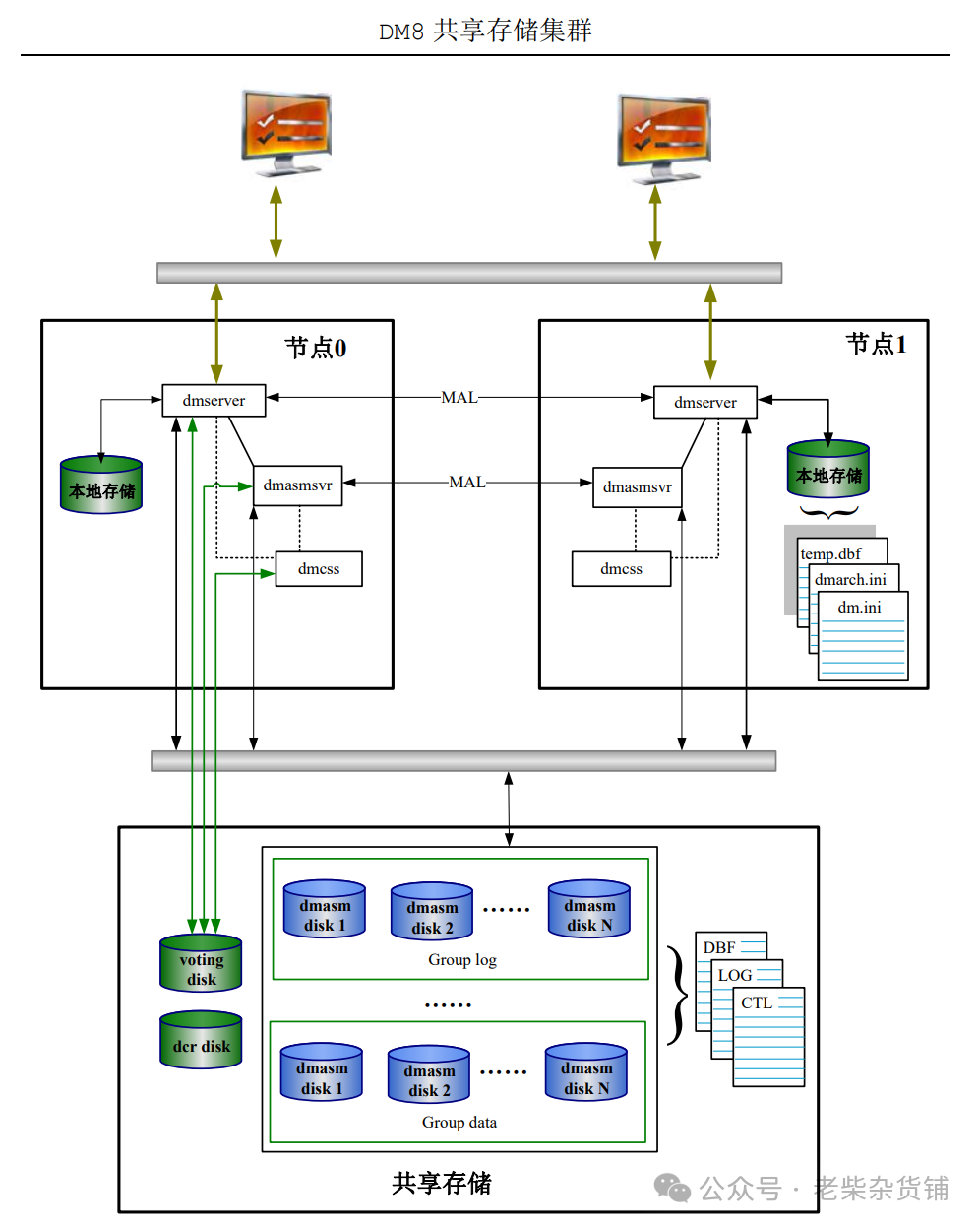 表决磁盘(Voting Disk):表决磁盘记录了集群成员信息,用于心跳检测和状态判定,确保集群稳定运行。DMCSS 通过 Voting Disk 传递控制命令,通知节点执行 相应命令。Voting Disk 必须存储在集群中所有节点都可以访问到的共享存储中,并且只 支持裸设备。在一个集群环境中只能配置一个表决磁盘。