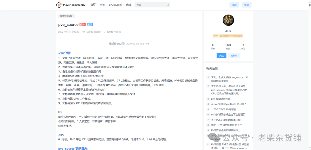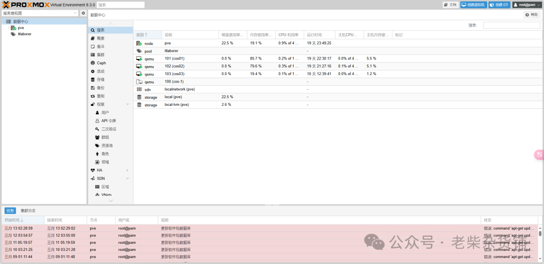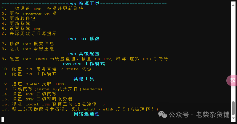 执行./pve_source即可打开pve_source脚本协议界面,在该界面处按照提示输入Y, 然后回车进入pve_source脚本界面,如下所示:2-更换Proxmox VE源: 由于pve默认的源访问较慢,所以建议更换pve源,用户根据自己需要选择相应的pve的软件源,等待脚本执行结束即可。6-去除无效订阅源提示: 执行该操作后可以避免每次进入pve界面都跳出提示。7-修改PVE概要信息: 执行该操作后,可以让pve界面显示更多的硬件信息,比如:硬盘信息、CPU温度等。10-配置CPU电源管理P-State状态: 执行该脚本选择让CPU在空闲状态下进入低功耗模式,有利于降低整个pve系统的功耗。以上是关于pve系统的一些设置建议,大家可以根据自己的需要进行相应设置,更详细的设置请参考pve_source官方说明。