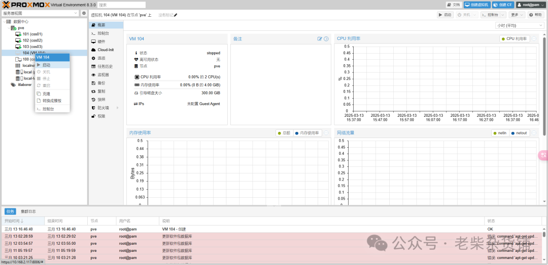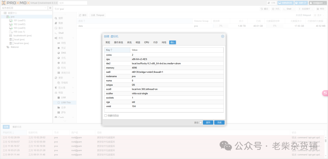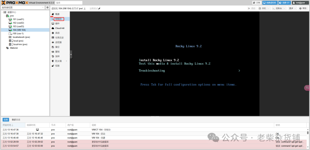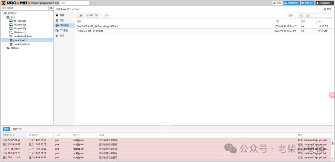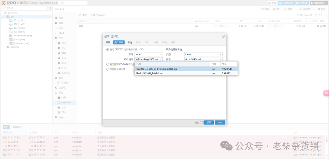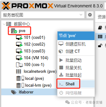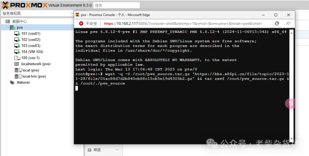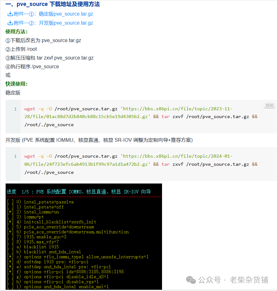 将下载好的proxmox-ve_x.x-x.iso复制到u盘目录下即可第四件事: 进入主板BIOS界面,将虚拟化技术相关的选项全部打开:Intel Virtual Technology,以及 VT-d SR-IOV 等等选项(如果主板支持)。虚拟化技术相关功能每个主板支持情况可能有不同,可能会多或少几个配置选项,搞不清楚可以去电商找到自己主板品牌的店铺然后向他们客服咨询,屡试不爽。• 进入Proxmox安装界面,选择 Install Proxmox VE(Graphical)完成安装后会显示PVE Web登录IP,记下该IP地址,用来登录Web界面。登录Web界面,用同一局域网的电脑,在浏览器页面输入上面PVE的IP地址,进入登录页面:登录后界面如下所示,即可开始PVE的配置和虚拟机安装等操作:从阿里云镜像源(https://mirrors.aliyun.com/centos/7.9.2009/isos/x86_64/)下载centos7.9每次安装完pve之后都需要换各种源、去掉弹窗、合并local-lvm等一系列的工作。这里推荐一个一键脚本,可以快速完成设置和优化:pve_source, 官网地址:https://bbs.x86pi.com/thread?topicId=20将稳定版快速使用代码粘贴如下,如果有想偷懒的同学,也可以直接用下面的命令快速下载并安装pve_source一键脚本。wget -q -O /root/pve_source.tar.gz 'https://bbs.x86pi.cn/file/topic/2023-11-28/file/01ac88d7d2b840cb88c15cb5e19d4305b2.gz' && tar zxvf /root/pve_source.tar.gz && /root/./pve_source
