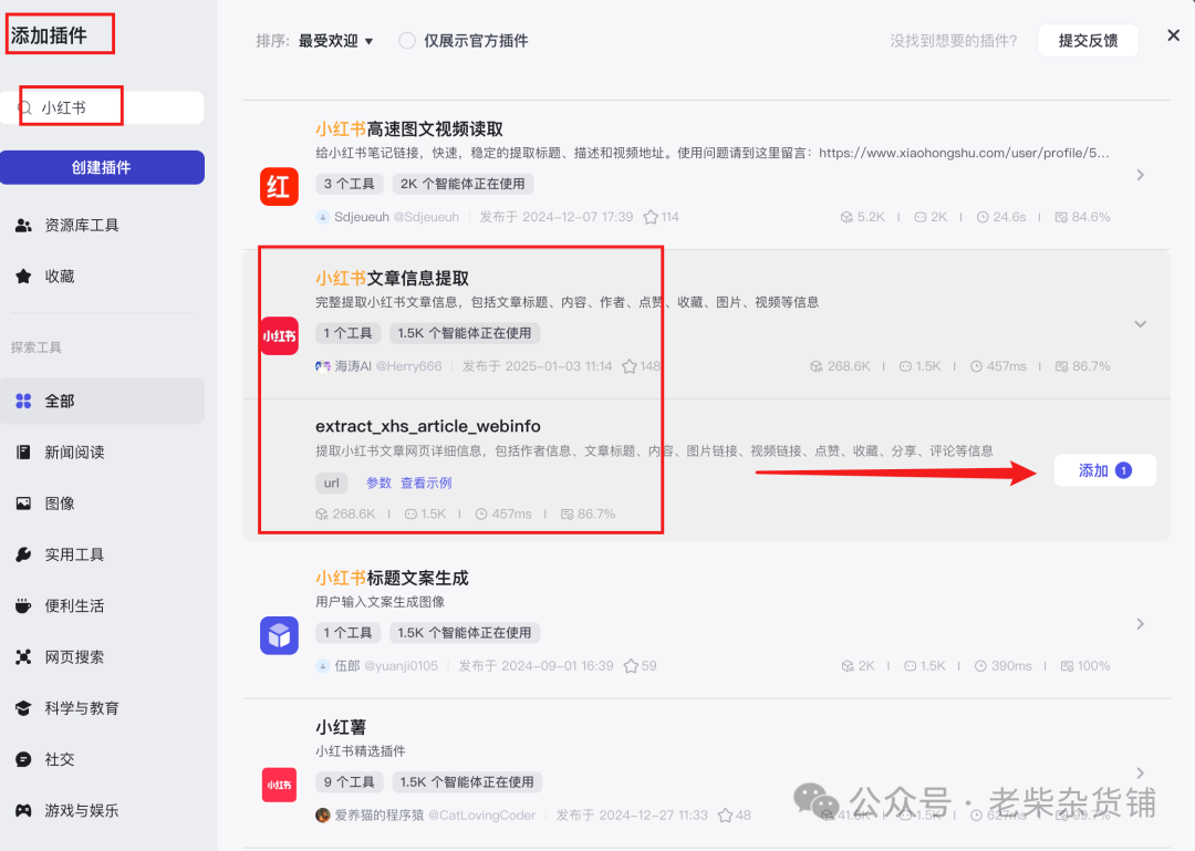 添加插件,搜索小红书文章信息提取插件