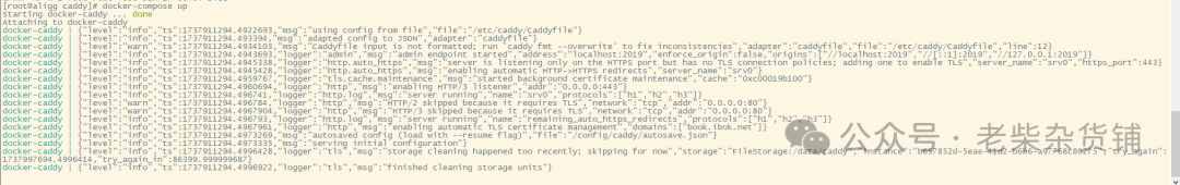 mkdir -p data/caddycd /data/caddyvi Caddyfilebook.ibok.net {# 监听 80 和 443 端口bind 0.0.0.0:80bind 0.0.0.0:443handle * {reverse_proxy http://60.205.207.207:8083}# 自动申请 SSL 证书# 反向代理到本地服务(可选)reverse_proxy http://60.205.207.207:8083}