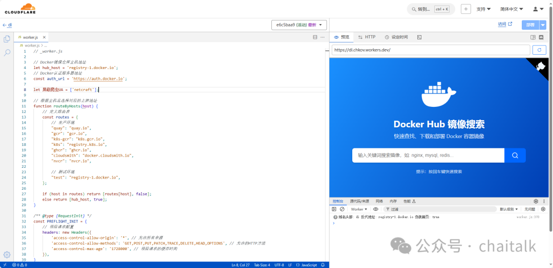 新建一个work,将如下代码粘贴到worker.js代码窗口中部署即可