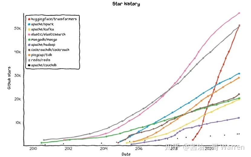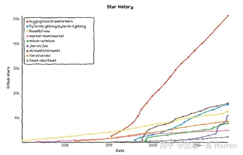 为了进行横向比较,Warren选取了不同开源项目进行对比。从GitHub Star增长的角度来直观地理解一下Hugging Face。