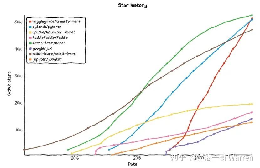 启发:2019年的时候,Warren兴奋地跟人介绍Hugging Face,对方给Warren的回复是:模型库的流行,不一定能做成商业化公司,SKlearn就是一个好例子,也很流行。但是看到Hugging Face的transformers库的star持续地快速增长,生态的持续繁荣,并获得了后续轮的融资。嗯,Elon Musk说得对,不要轻易地用类比,要用第一性原理去分析!要相信自己的判断!