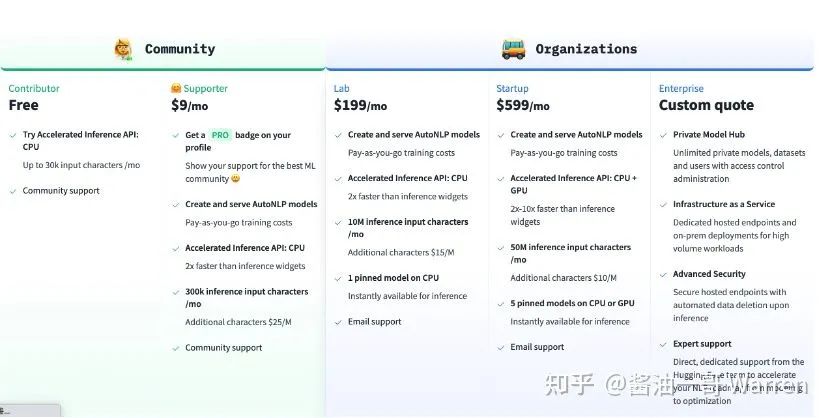 与GitHub的私有仓库收费类似,Hugging Face只有企业版才有私有的Model Hub。