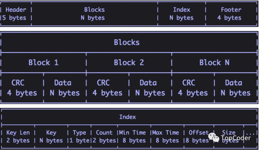 Index:索引顺序按照先key后时间戳来,如果key相同则按照时间戳排序,key包括measurement+tag set+一个filed,如果一个point包含多个field,则包含多个索引条目;每个索引条目以key len和key开始,标准的TLV格式,然后是block类型(float,int,bool,string)以及该block的条目数,之后是block的最小、最大时间戳,最后是block所在的文件偏移量以及block大小 --- 也就是说,包含该key的TSM文件中每个block都有一个索引block条目;