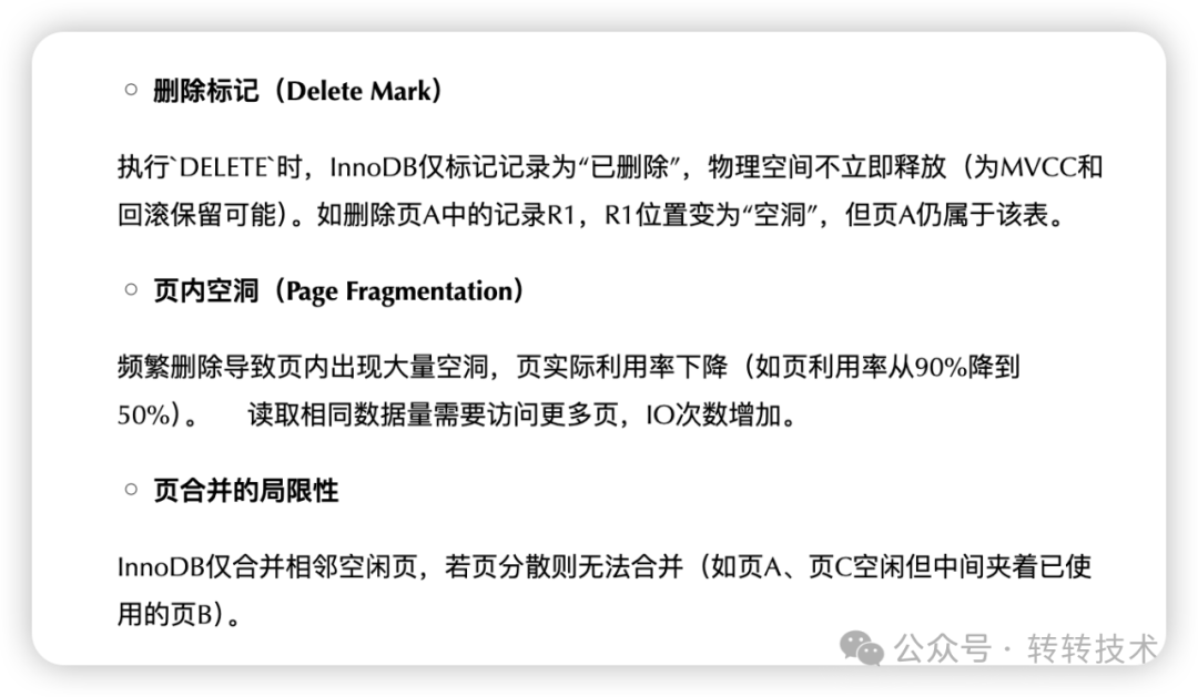 当内存碎片过多时,首当其冲会让物理IO被放大。原本“id=1,id=10,id=15”这三条记录读一次数据页就能够拿到,现在由于这几条数据被分散在多个数据页中,从而引发IO次数增多。同时,数据页是加载到缓冲池(Buffer Pool)里面的,这也会导致缓存命中率下降。