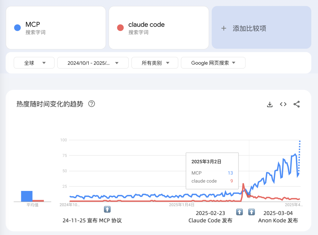 MCP 这个缩写在其他领域的自然搜索流量早在 2024-11-25 之前就已经存在了,所以可以认为, Model Context Protocl 从11月底发布到今年三月基本上没什么热度,而是在今年3月1号才突然爆火。