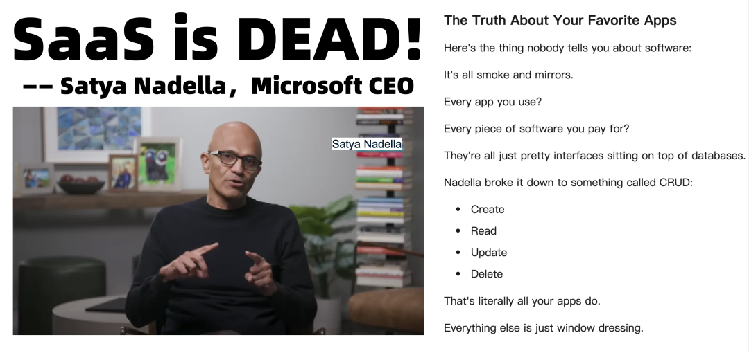 微软 CEO 纳德拉最近公开表示:“未来的应用,将是 AI Agent 直接连接数据库进行 CRUD 操作。” 我非常赞同这一观点——AI 时代的应用离不开数据库,“后端开发”或许会逐渐消失,但数据库将依然重要。
