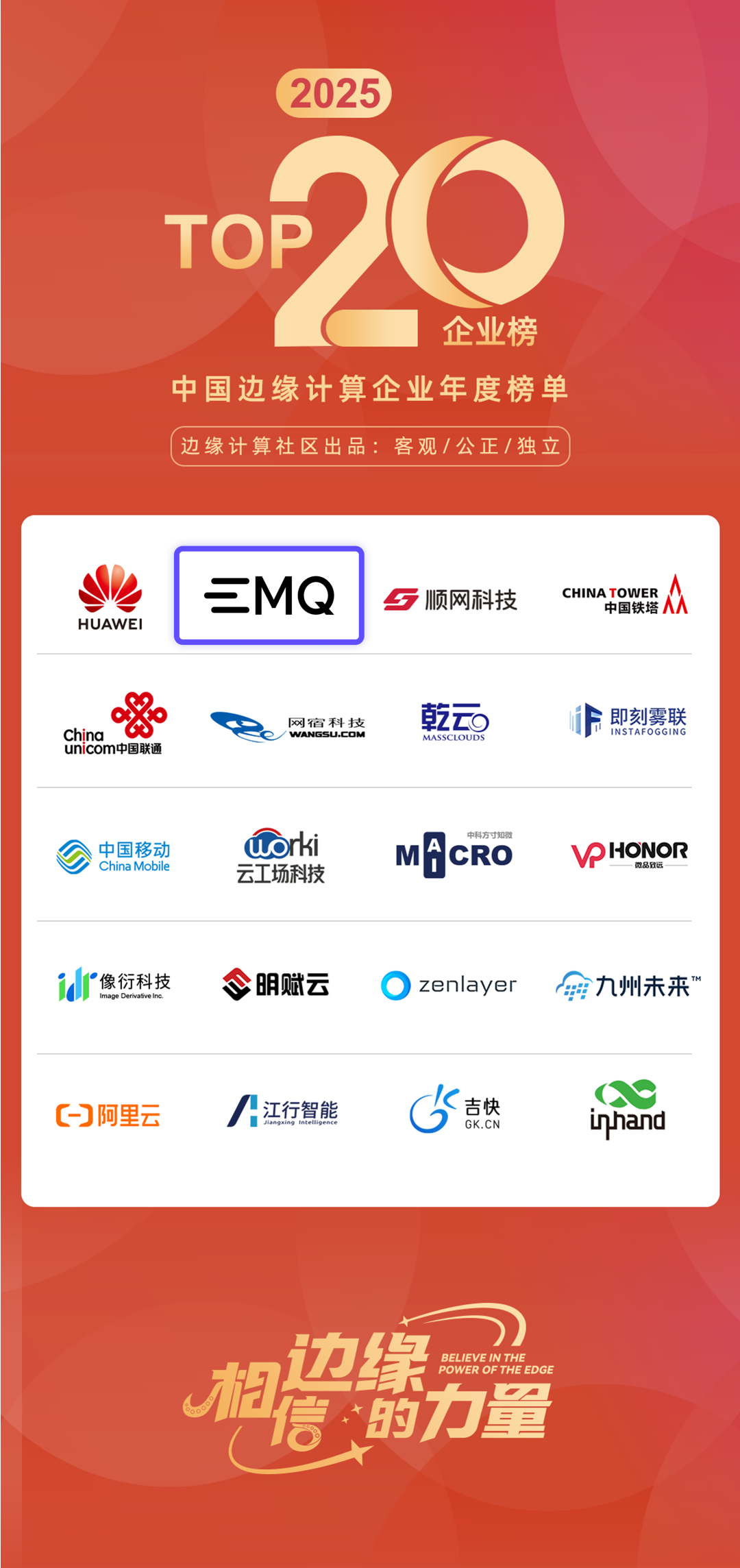 近日,边缘计算社区历经多轮严格评选,综合考量企业技术实力、商业化能力和行业影响力,正式公布了 2025 中国边缘计算企业 20 强。映云科技(EMQ)凭借在边缘计算领域的持续深耕与技术创新,再度强势登榜,印证了 EMQ 帮助海量设备在边缘侧实现高效连接、实时计算与智能决策的核心价值。