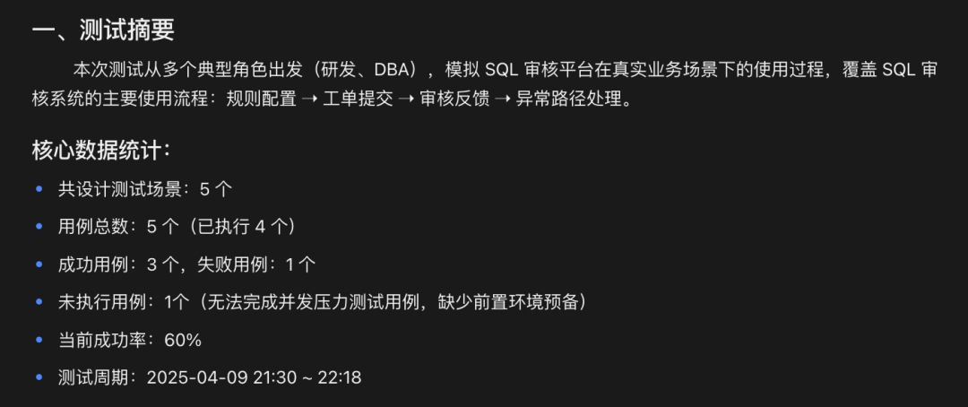 下面,我们以近期对 SQL 审核系统[1] 的阶段性测试为例,来看看 问简平台 如何让测试报告真正发挥价值的。