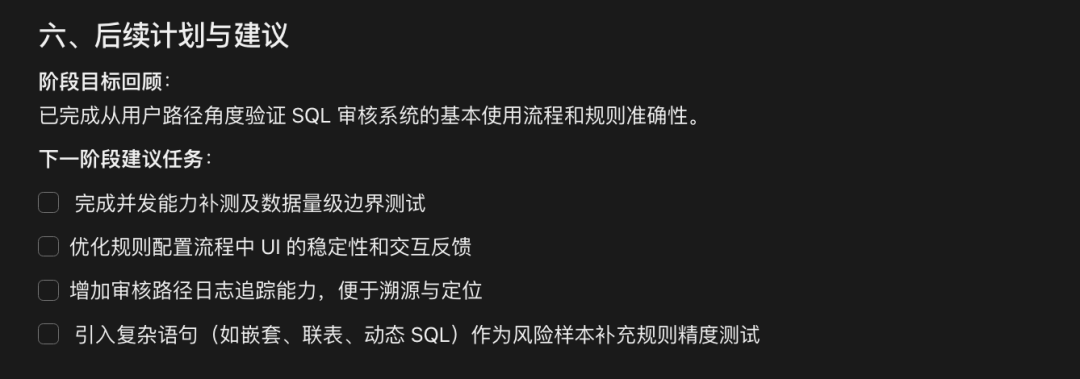 先输入一句话:对 SQL 审核平台的审核功能进行验证,并记录日志。