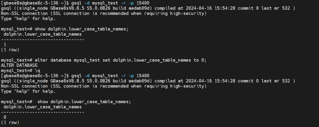 GBase 8c 表名默认为小写,为满足兼容 MySQL 大小写问题,支持库session级别参数dolphin.lower_case_table_names,默认值1(小写/大小写不敏感),设置为0 支持大写。配置后重连生效。