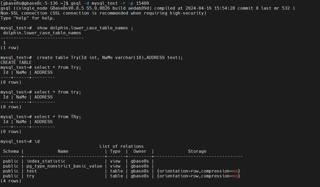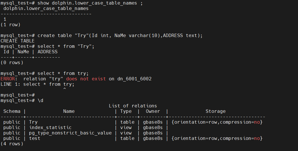 另外 GBase 8c (dolphin.lower_case_table_names=1)表名默认为小写时 ,创建时表名加双引号,也支持识别为大写。