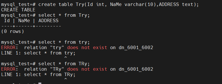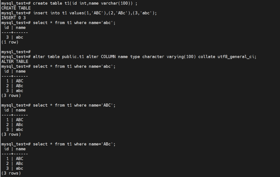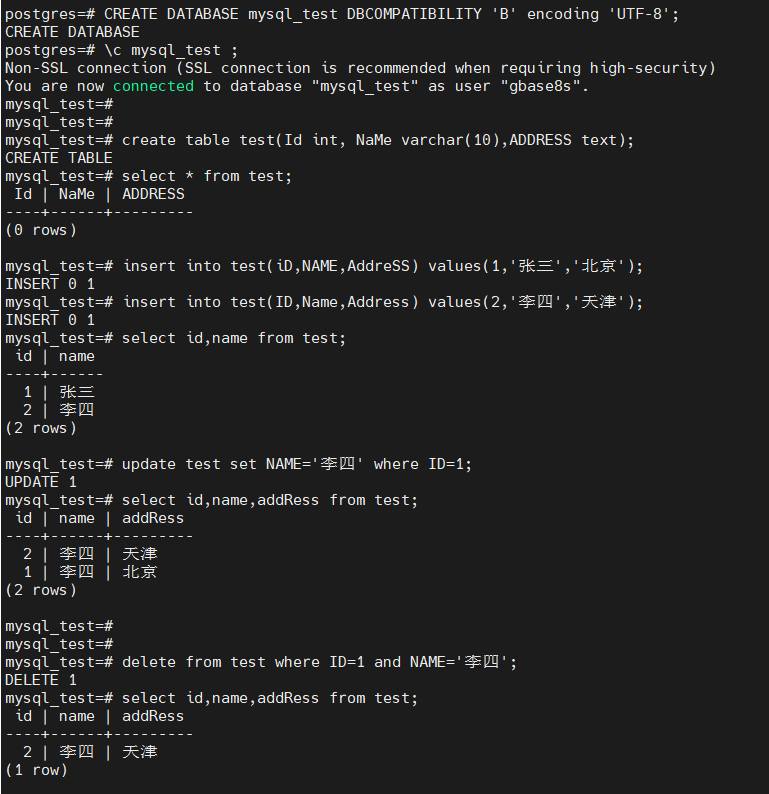 # 创建兼容 MySQL 的数据库CREATE DATABASE mysql_test DBCOMPATIBILITY 'B' encoding 'UTF-8';# 创建 test 测试表(列名大小写混写)create table test(Id int, NaMe varchar(10),ADDRESS text);select * from test;insert into test values(1,'张三','北京');insert into test values(2,'李四','天津');select id,name from test;update test set NAME='李四' where ID=1;select id,name,addRess from test;delete from test where ID=1 and NAME='李四';select id,name,addRess from test;