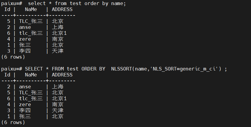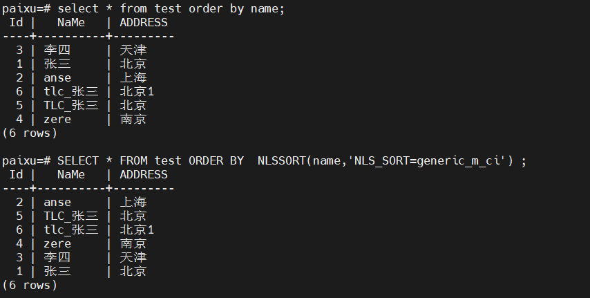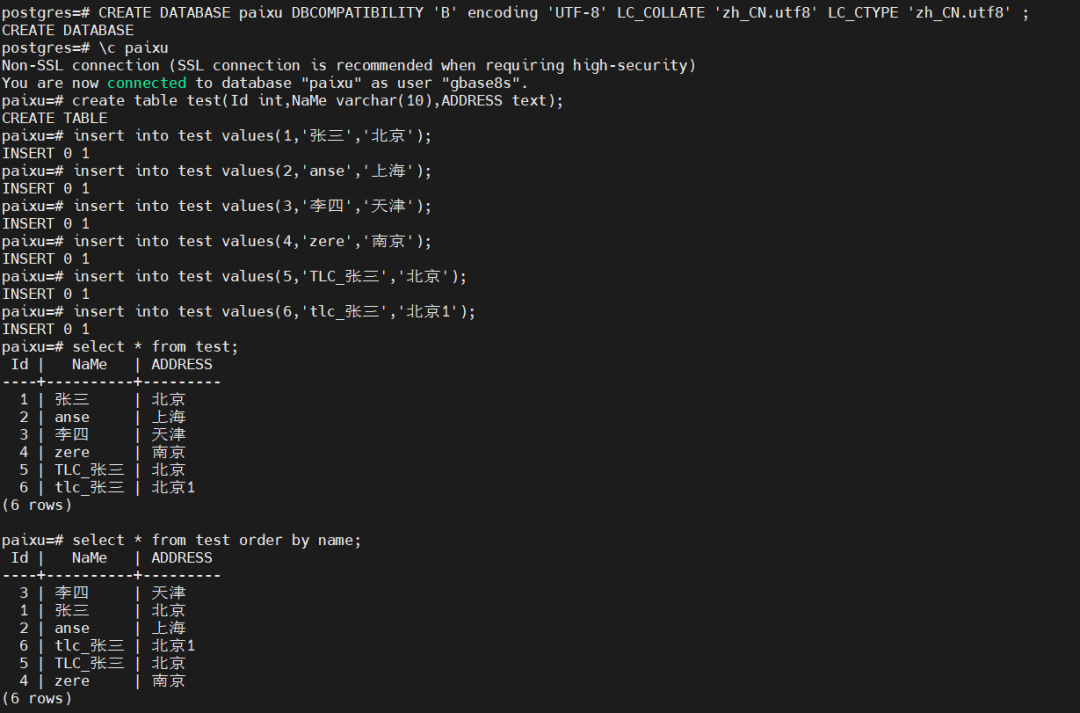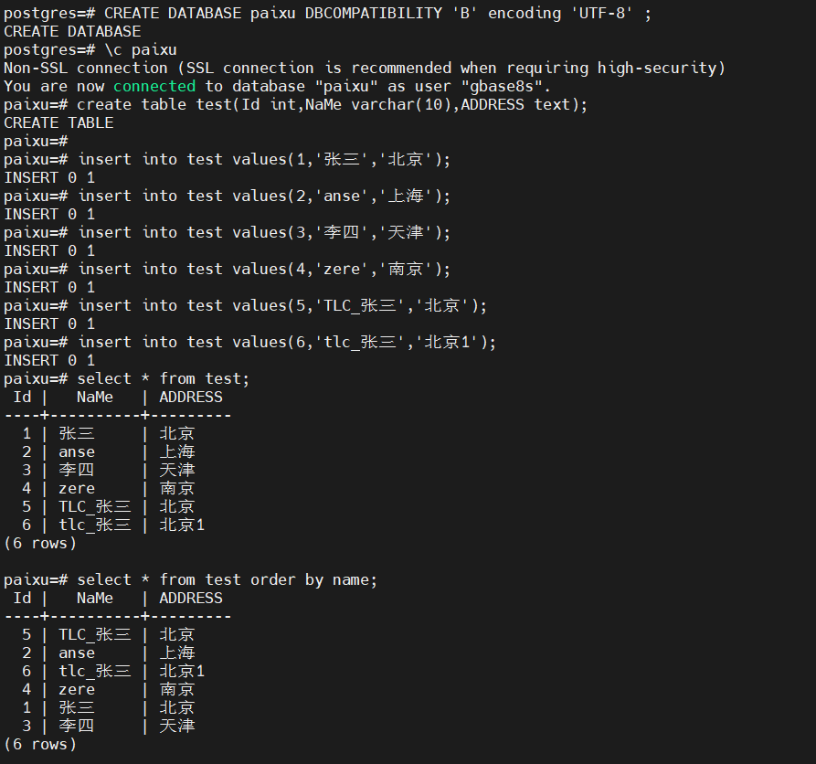 GBase 8c 兼容MySQL,字符集UTF8,Collation排序规则默认zh_CN.utf8,Ctype字符类型默认zh_CN.utf8下 。指定字段默认排序,默认首字符按照中文在前,英文在后(前缀字符相同的英文,小写在大写之前)