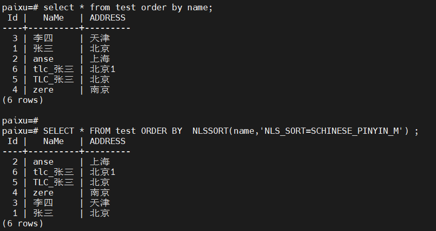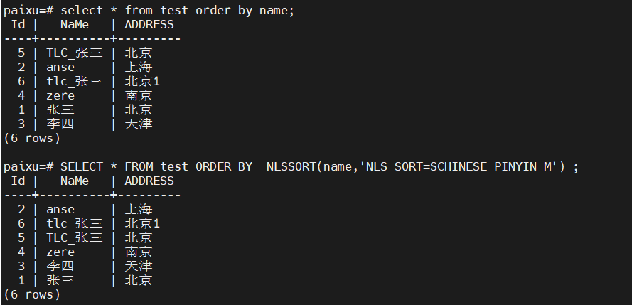 ORDER BY NLSSORT(name,'NLS_SORT=SCHINESE_PINYIN_M')