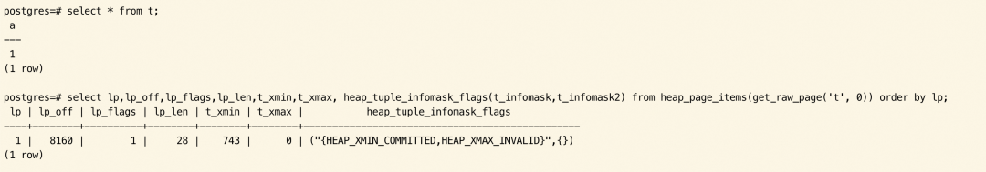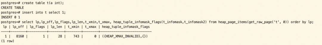 在 SELECT 扫描到该条 tuple 后,HEAP_XMIN_COMMITTED 被成功设置。