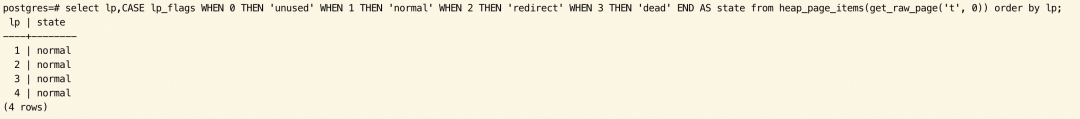 没有执行 SELECT 前,4 条 tuple 的状态都为 normal。