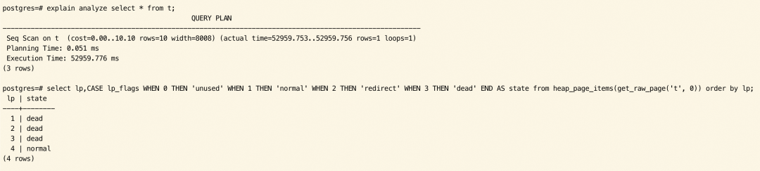 执行 SELECT 后,页面发生了修剪,其中有 3 条 tuple 被回收,并且其行指针被标记为 dead。