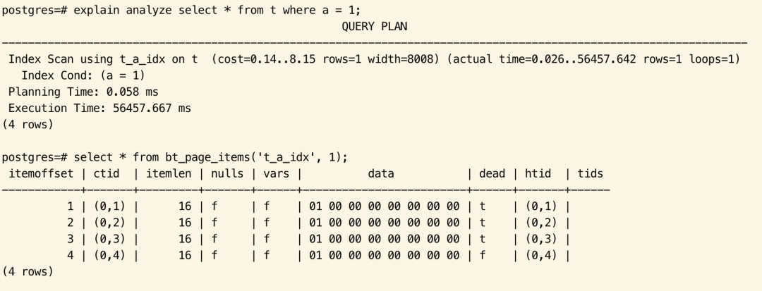 索引扫描时,发现对应 tuple 的行指针为 dead 状态,这意味着元组已经不存在了,这个行指针应该被忽略。