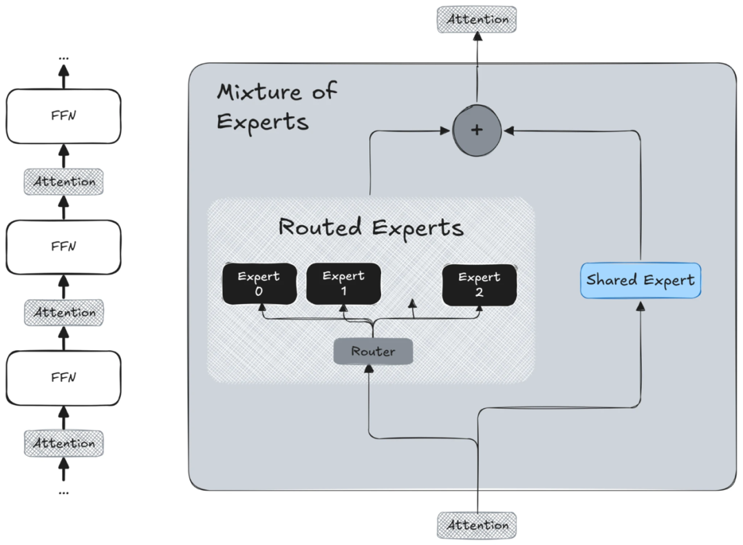 Llama 4 采用了专家混合(MoE)的架构。简单说,这个模型里内置了很多“子模型专家”,每次处理输入时,只激活其中一小部分最合适的专家。这样的设计不仅提高了训练效率,还增强了推理阶段的可扩展性。通过将计算负载分配给不同的专家子模型,Llama 4 能够同时处理更多请求,使其能够在生产环境中运行,而无需依赖大型单一 GPU 实例。