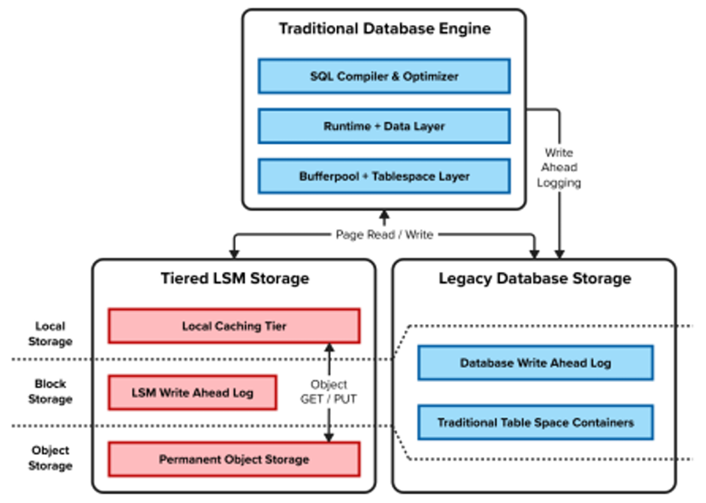 在 MPP 集群的每个 Db2 引擎节点中,从架构上看,新的分层 LSM 存储层位于传统存储层旁边,Db2 缓冲池继续作为内存中的数据页面缓存,而其上所有层,包括维护页面存储组织的表空间层、运行时和数据层、SQL 编译器和优化器层。