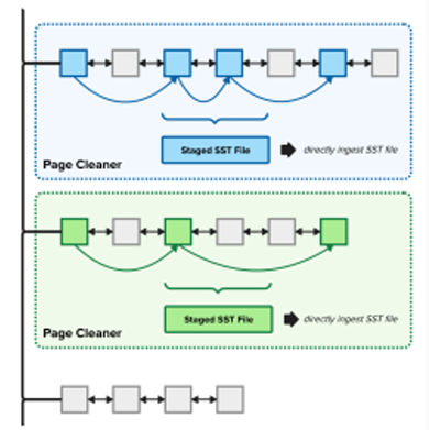 LSM树存储层引入后,减少日志事务模式为KF摄取路径优化创造机会。在批量插入场景下,利用列组织页面的仅追加I/O模式,将页面写入并行化到多个异步页面清理器,并行异步生成SST文件再上传,在某些情况下,一些与并行操作同时发生的页面写入落在相同的插入范围内,这回引发如下问题: