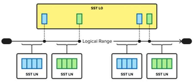 通过非优化写入路径写入的页面会与这些范围重叠。逻辑范围使用写入批优化写入到 N 级(LN)SST 文件中的数据页面,并使用列索引作为聚类键进行聚类,以及通过正常写入路径写入的重叠 SST 文件在 L0 级。